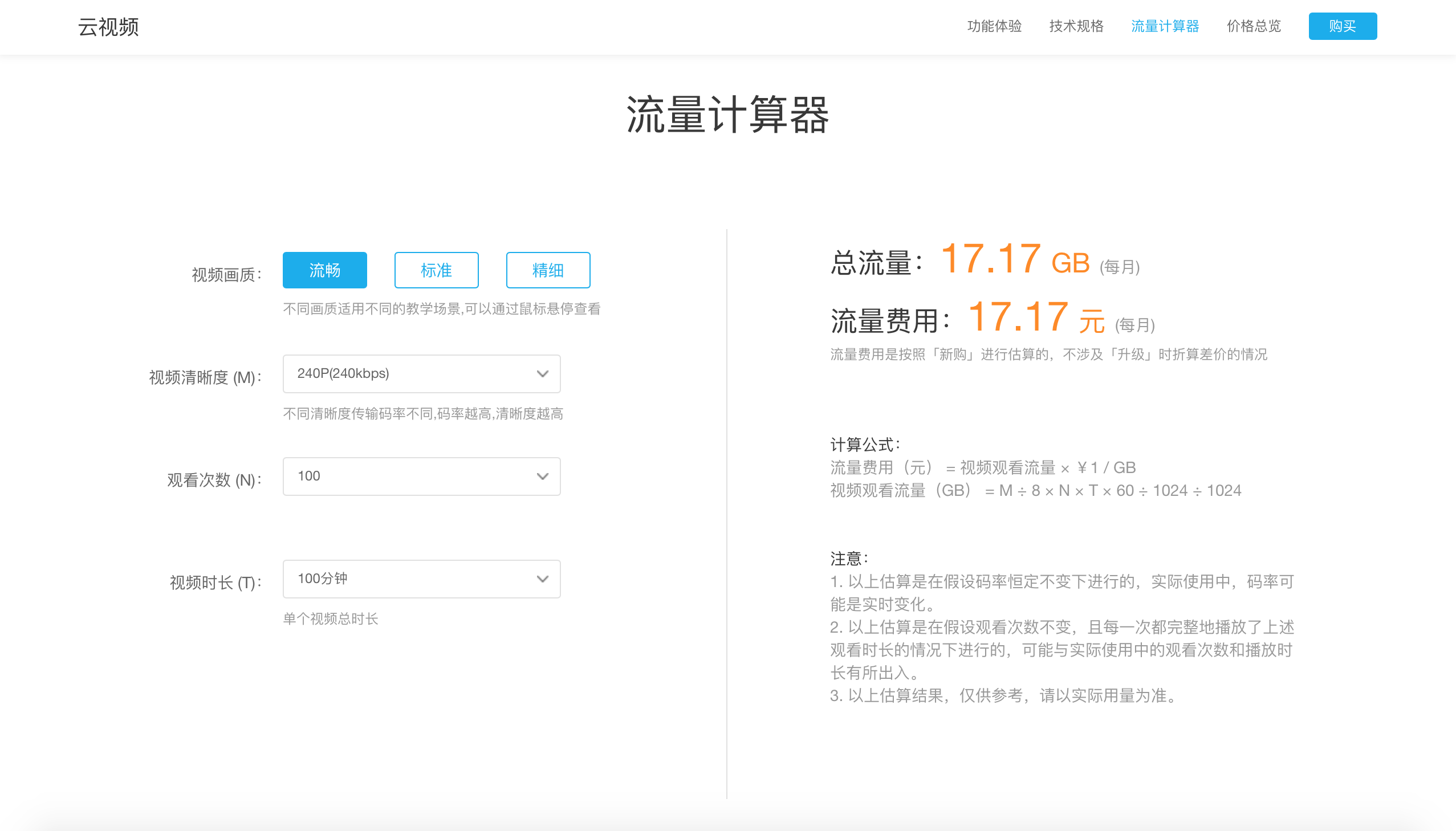 在购买、升级、续费云视频时,同样可以随时调出计算器进行核算,不需要切换页面,方便快捷。如下图: 您可以通过气球云首页的「产品服务」->「云视频」,进入云视频的介绍页面,并在该页面的二级导航中找到「流量计算器」的入口。